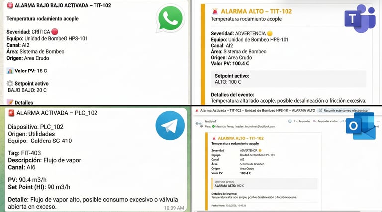 NotifyIoT envía alarmas vía WhatsApp, Telegram, Teams, Gmail y Outlook al personal adecuado.